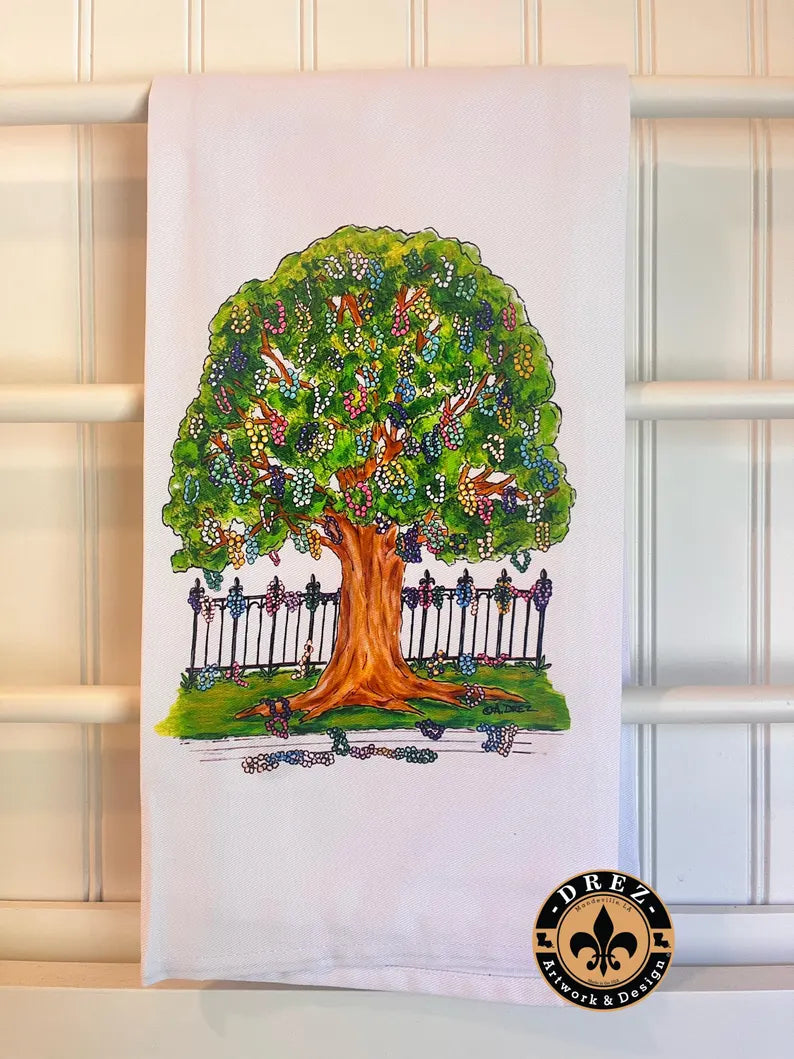 Custom printed 100% cotton, NOLA style, tea towels! -Care instructions on inside label -Overall size is 19.5” x 27”. Tri-fold size is 7” x 13.5”. -Printed on 1 side - Hanging loop on back side top corner -Original image design by Ann Drez.