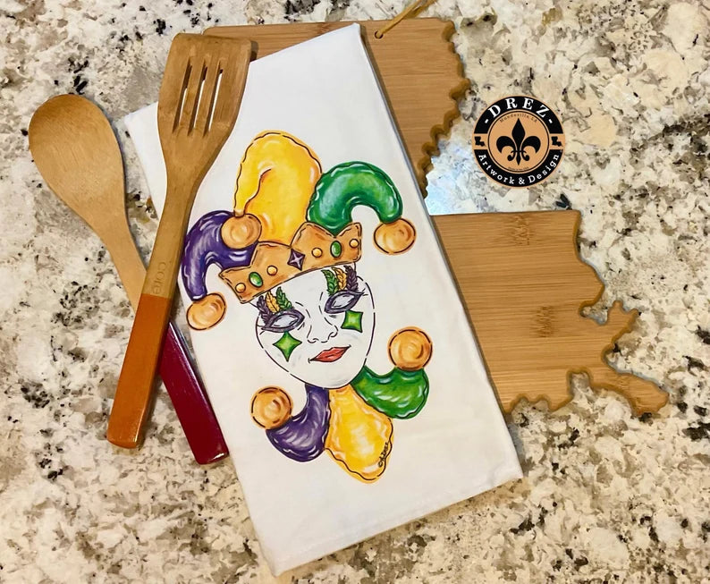 Custom printed 100% cotton, NOLA style, tea towels! -Care instructions on inside label -Overall size is 19.5” x 27”. Tri-fold size is 7” x 13.5”. -Printed on 1 side - Hanging loop on back side top corner -Original image design by Ann Drez.