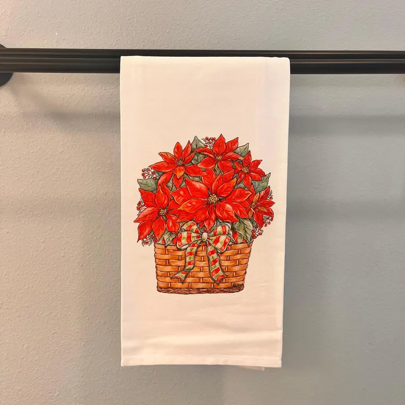 Poinsettia Red/Green Bow Christmas Tea Towel