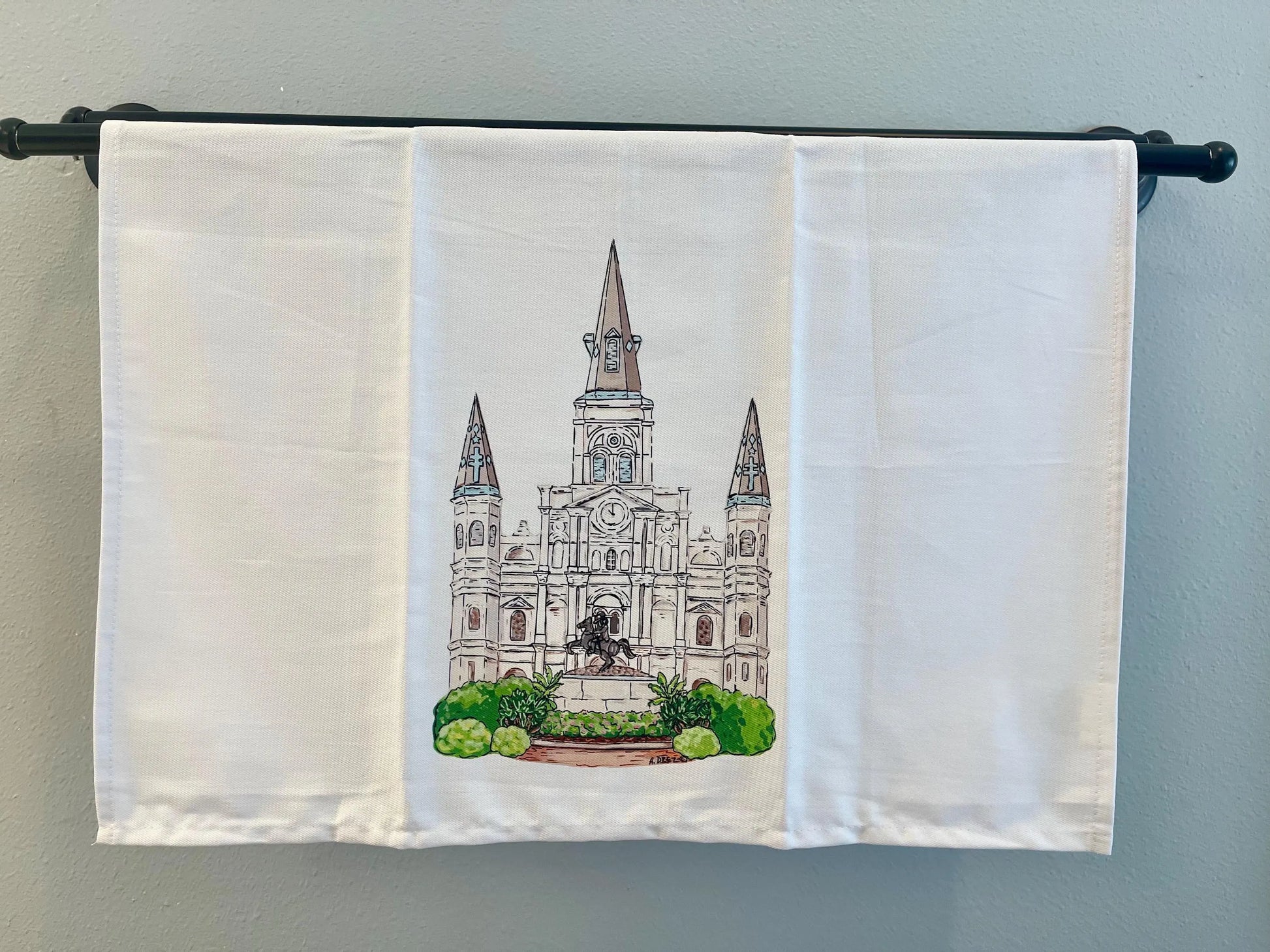 Custom printed 100% cotton, NOLA style, tea towels! -Care instructions on inside label -Overall size is 19.5” x 27”. Tri-fold size is 7” x 13.5”. -Printed on 1 side - Hanging loop on back side top corner -Original image design by Ann Drez.